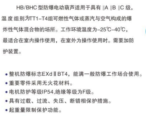 HB/BHC型防爆電動葫蘆適用于具有ABC級,溫度組別為TT1-T4組可燃性氣體或蒸汽與空氣構(gòu)成的爆炸性氣體混合物的場所。工作環(huán)境溫度為-25℃-40℃,最適合在室內(nèi)操作使用,在室外為操作使用時。需要加防護裝置。